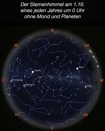 Bevor Sie mit der Beobachtung beginnen, informieren Sie sich, wann die Sonne untergeht und beginnen dann die Beobachtungen mindestens eineinhalb Stunden später, so dass der Himmel richtig dunkel ist. Der volle Mond sollte für eine gute Sicht auf die Sterne nicht am Himmel stehen, denn das Mondlicht scheint so hell, dass schwächere Sterne oder die Milchstraße kaum zu sehen sind. Unten auf dieser Seite finden Sie einen Mondkalender. Etwa vom 21. Mai bis zum 21. Juli werden die Nächte durch die Mitternachtsdämmerung nicht vollständig dunkel. Die hellste ist auch gleichzeitig die kürzeste Nacht des Jahres am 21. Juni.
